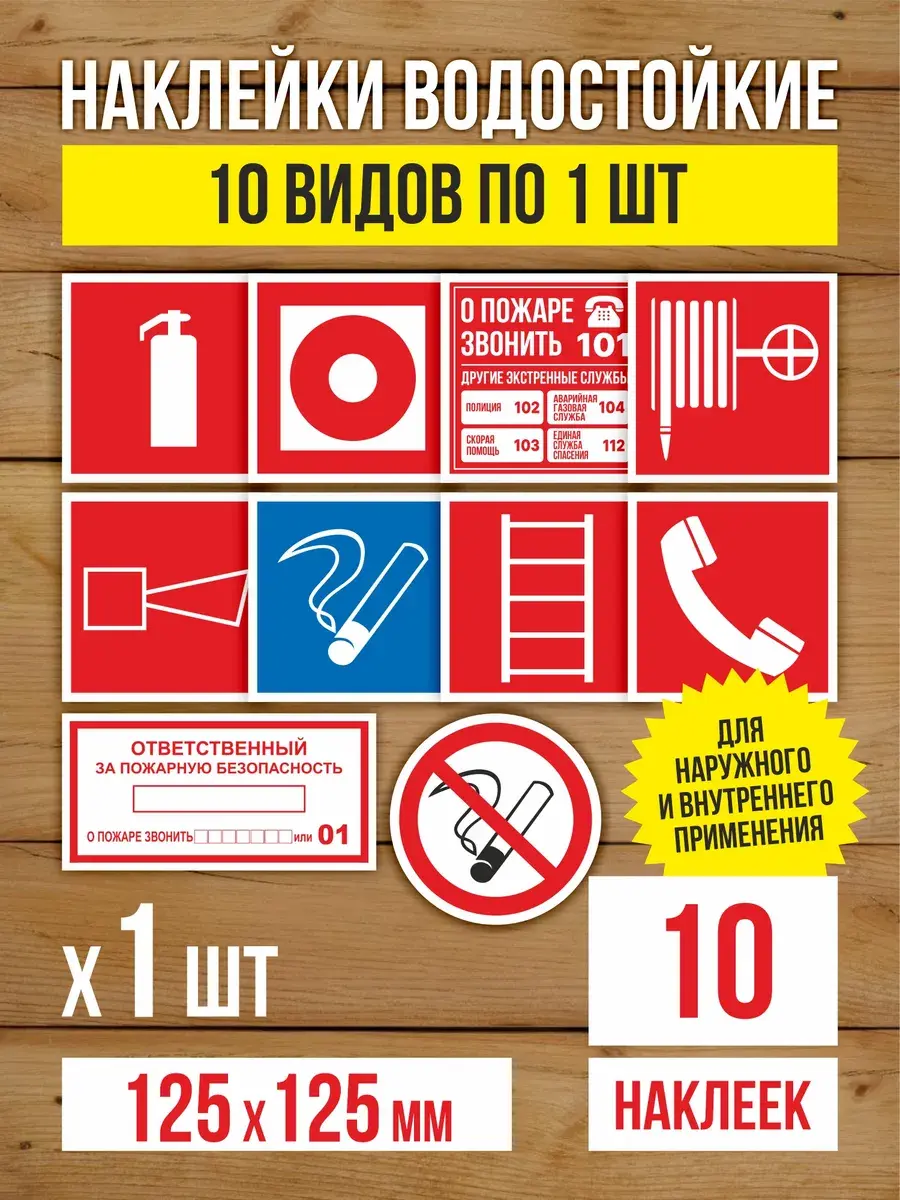 Наклейки Пожарная безопасность виниловые, ГОСТ, 125х125 мм, 10 видов по 1 шт