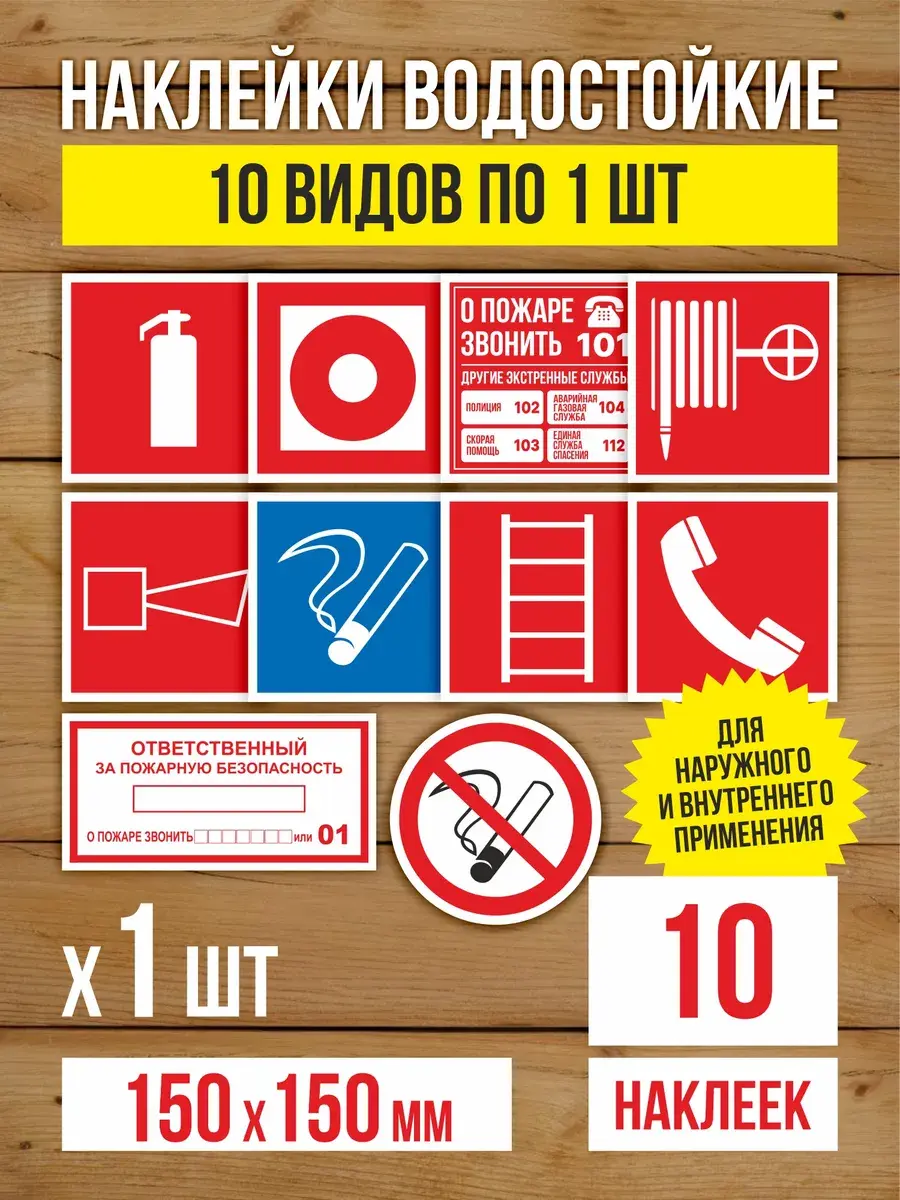 Наклейки Пожарная безопасность виниловые, ГОСТ, 150х150 мм, 10 видов по 1 шт