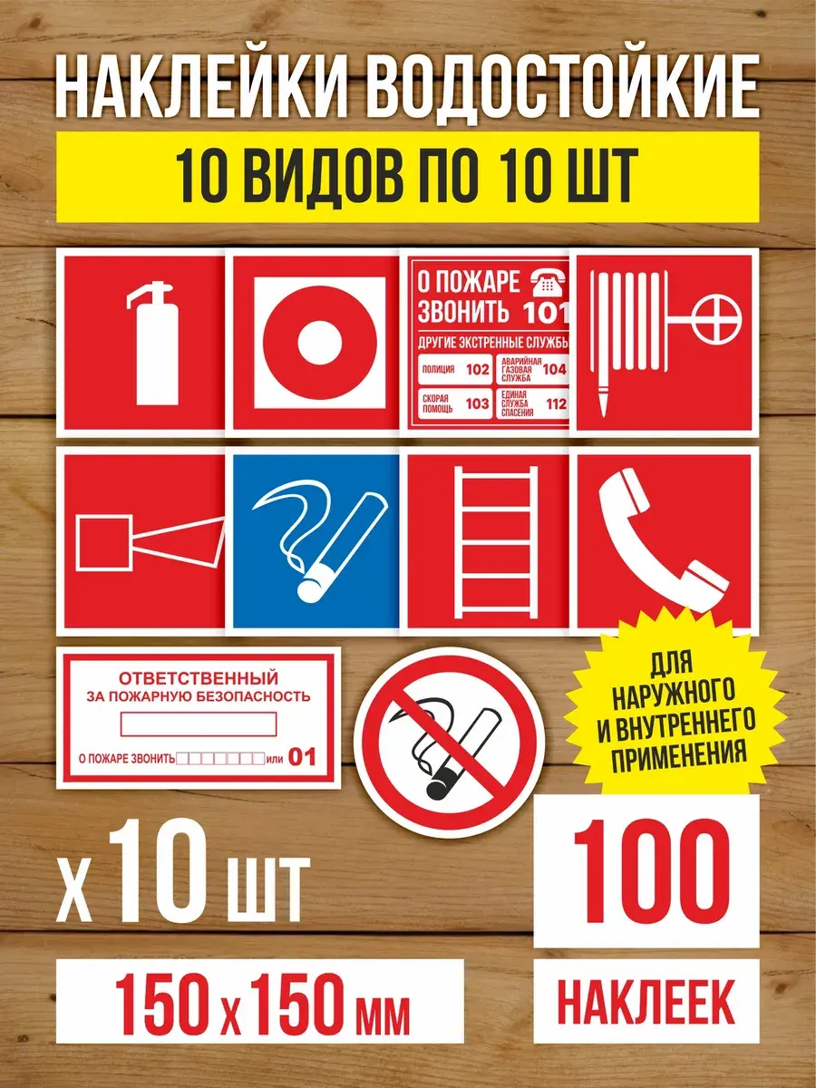 Наклейки Пожарная безопасность виниловые, ГОСТ, 150х150 мм, 10 видов по 10 шт