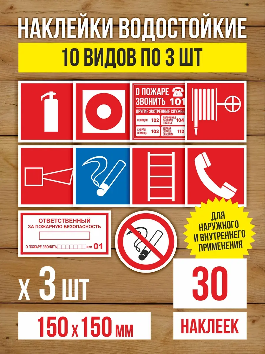 Наклейки Пожарная безопасность виниловые, ГОСТ, 150х150 мм, 10 видов по 3 шт